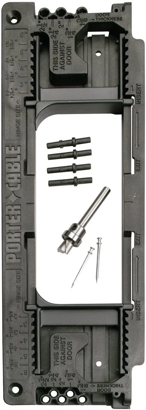 • To create the Door Hinge Template 59370 Porter Cable, you will need to use a router and the template guide. Start by securing the template to the door. Position your router so that it is centered on the screw hole mark on the template, and adjust the cutting depth of your bit. Carefully rout out the hole using a steady hand. You may need to repeat this step to create additional holes as necessary. Once all holes have been created, remove the clamps and template from the door. Finally, secure the hinge into place with screws.