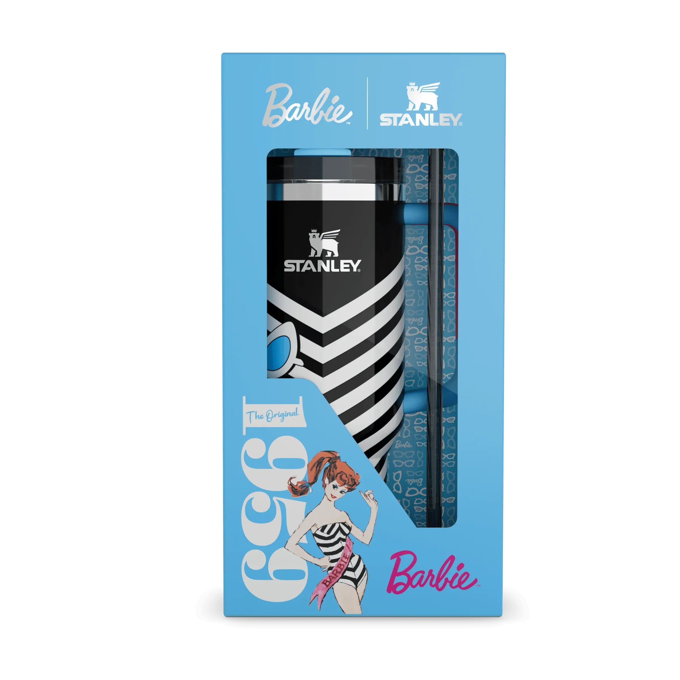 A bold chevron print pays homage to the OG Barbie™ doll in a black and white vintage swimsuit. Pool blue and hot pink accents complement the iconic cat-eye sunglasses.