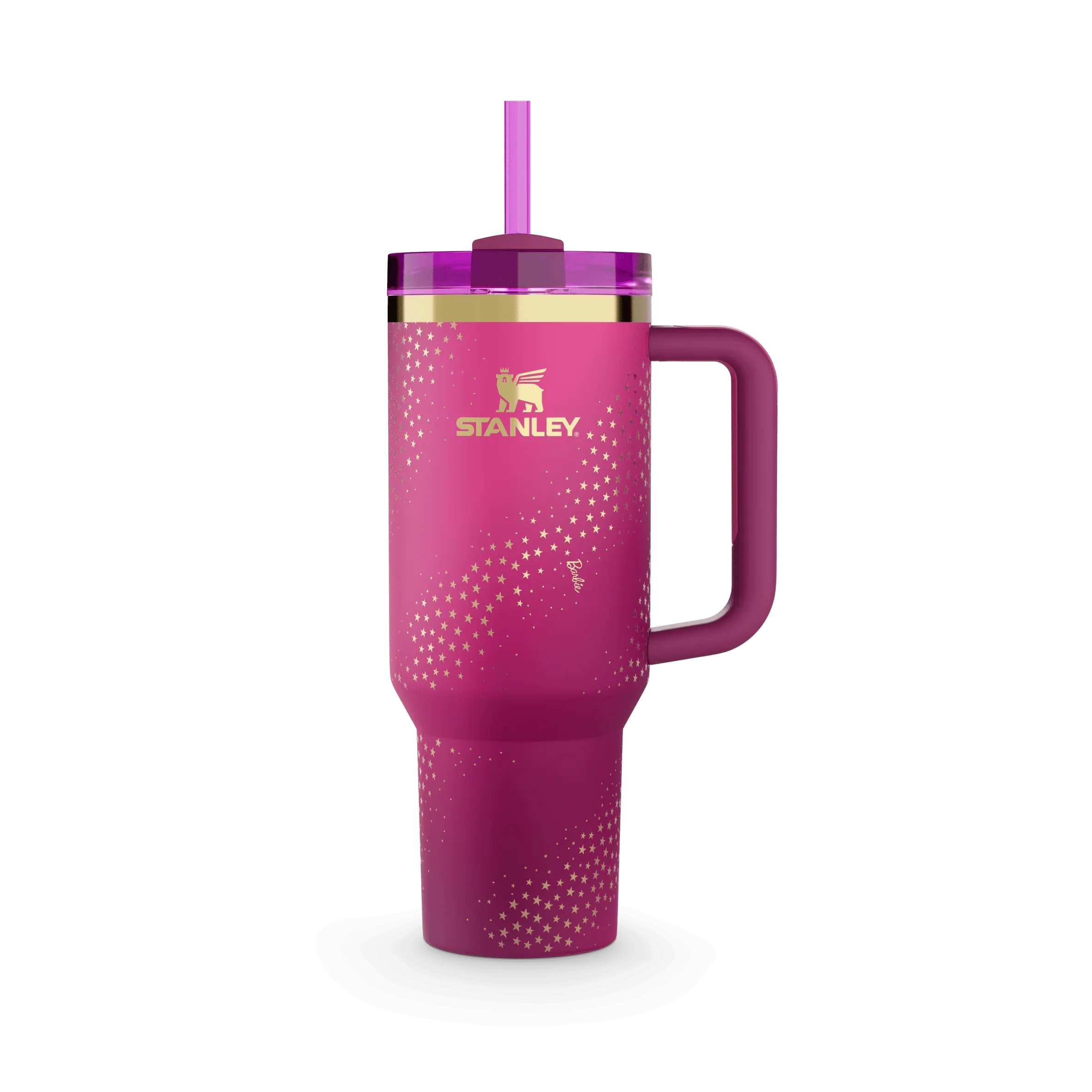 The hot pink and purple gradient of the Superstar Quencher® is all about glitz and glam. A pattern of gold, dainty stars echo the sparkle and star-shaped stand of the Superstar Barbie™ doll.